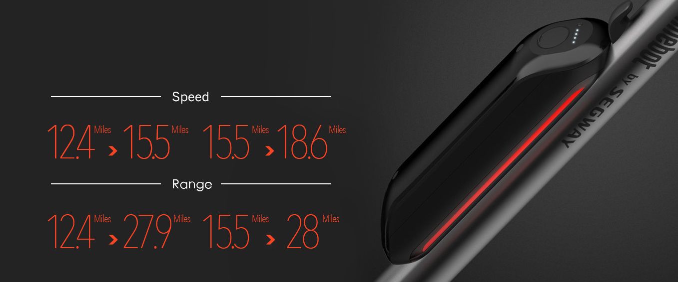 The Extended Battery is compatible with the Ninebot KickScooter by Segway ES1 & ES2. It is easy to install and nearly doubles the range of both models from 15.5 miles to 28 miles. It also increases the speed of the ES1 and ES2 to 15.5 mph and 18.6 mph respectively.